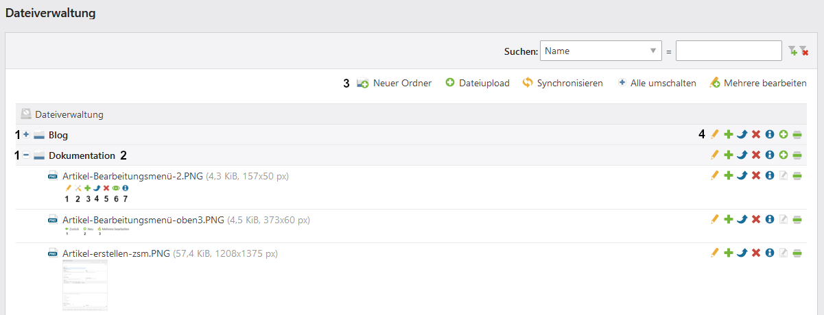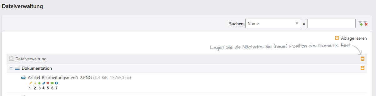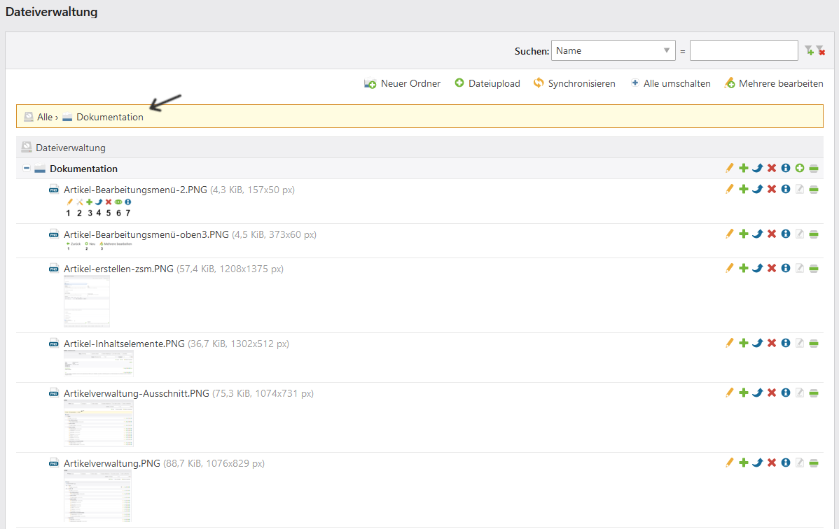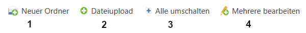 Mit einem Linksklick auf den Namen eines Ordners wird Ihnen ein Ausschnitt aus der Liste dargestellt. Es wird Ihnen der entsprechende Ordner mit allen Unter-Ordnern und Dateien angezeigt. Über den gelb hinterlegten Pfad oberhalb der Liste gelangen Sie auf die vorherigen Ebenen zurück. Mit einem Linksklick auf Alle gelangen Sie wieder zur gesamten Übersicht. Diese Funktion ist besonders hilfreich bei sehr großen Ordnerstrukturen. - Bearbeitungsmenü oben
