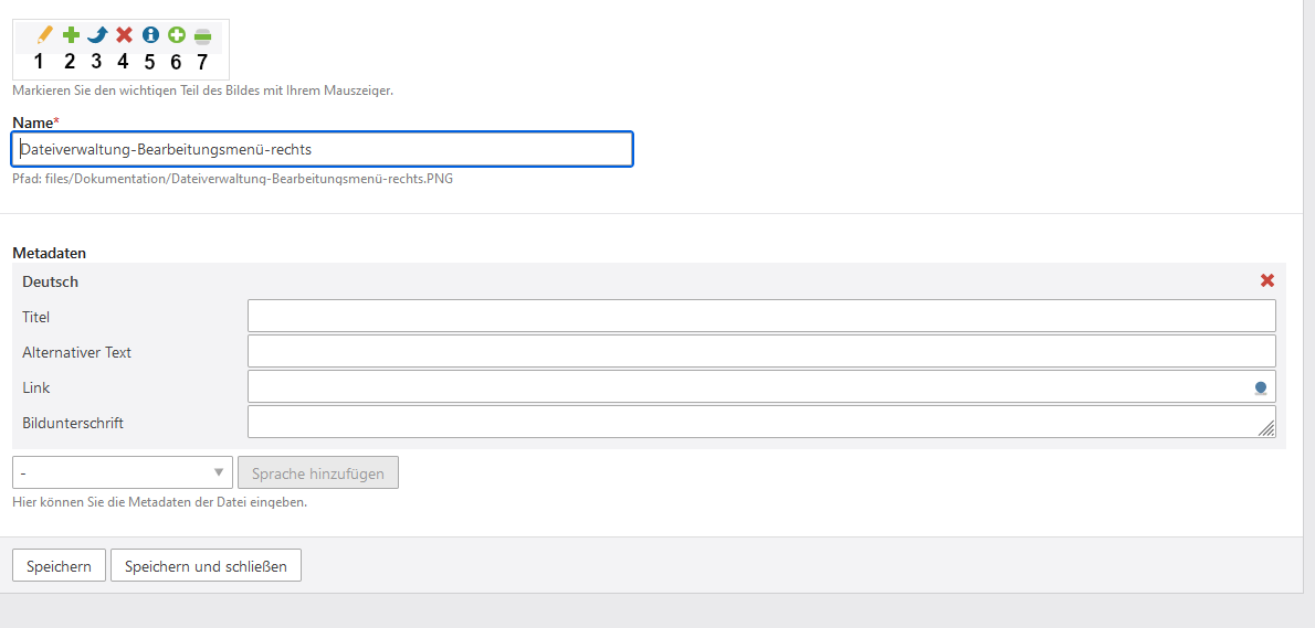 Hier können Sie den Dateinamen ändern, einen Titel vergeben, den Alternativtext für mehr Barrierefreiheit festlegen, einen Link hinzufügen und eine Bildunterschrift eingeben. Diese sogenannten Metadaten können bei der Erstellung von Inhalten überschrieben werden. zu Inhalte erstellen - Datei oder Ordner kopieren