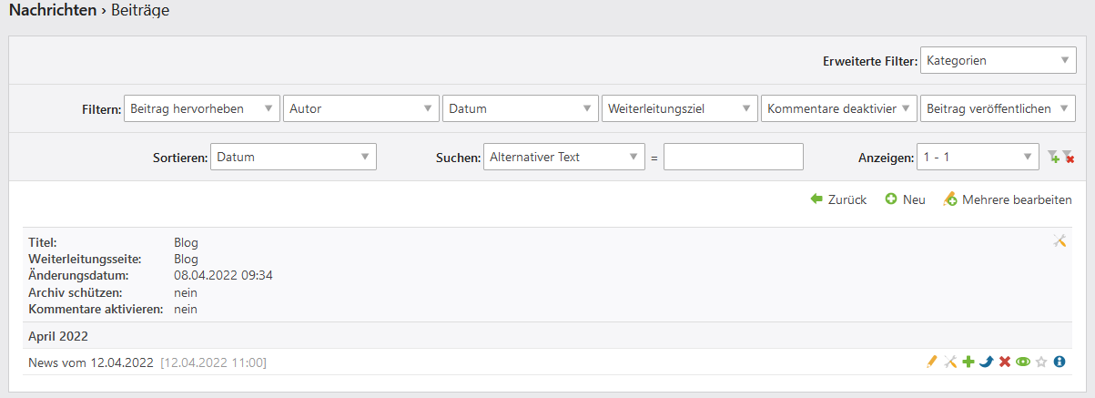 Um einer Nachricht Inhaltselemente hinzuzufügen, suchen Sie zunächst die Nachricht im entsprechenden Nachrichtenarchiv, zu welcher Sie weitere Inhalte erstellen möchten und gehen rechts im Bearbeitungsmenü auf Inhalte bearbeiten. Jetzt öffnet sich die Bearbeitungsansicht.